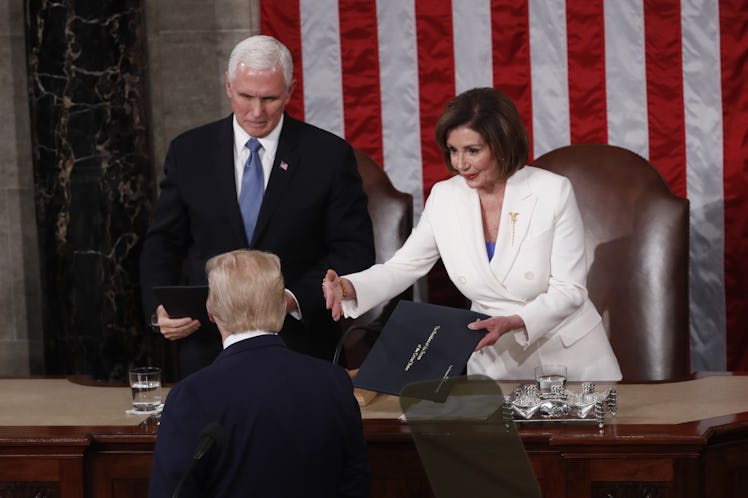 But according to The New York Times, Trump wasn't the only one who snubbed Pelosi. During her introduction of Trump ahead of his speech, Pelosi normally would have said “I have the high privilege and distinct honor of presenting to you the president of the United States.” As the Times pointed out, Pelosi omitted many of these laudatory words and instead said, “Members of Congress, the President of the United States.” Elite Daily did not immediately hear back from the White House or Pelosi's office about the handshake snub or the altered introduction.