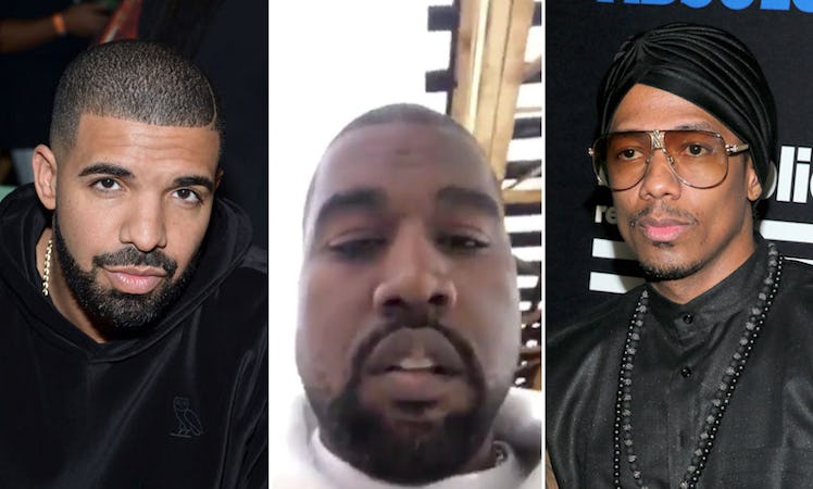 Kanye West has officially changed his preferred rant social media platform from Twitter to Instagram. This time, he's coming for Drake, Nick Cannon, and Tyson Beckford. You might ask, "What do these three men have in common?" Oh, just that they've made reference to Kanye West's wife Kim Kardashian in one way or the other. Clearly, Yeezy is not having it. The videos of Kanye West calling out Nick Cannon and Drake are a LOT to take in, but you better believe fans just took a spontaneous work break to watch all the drama. Elite Daily reached out to West, Cannon, and Drake's teams for comment on the videos but did not hear back by the time of publication.