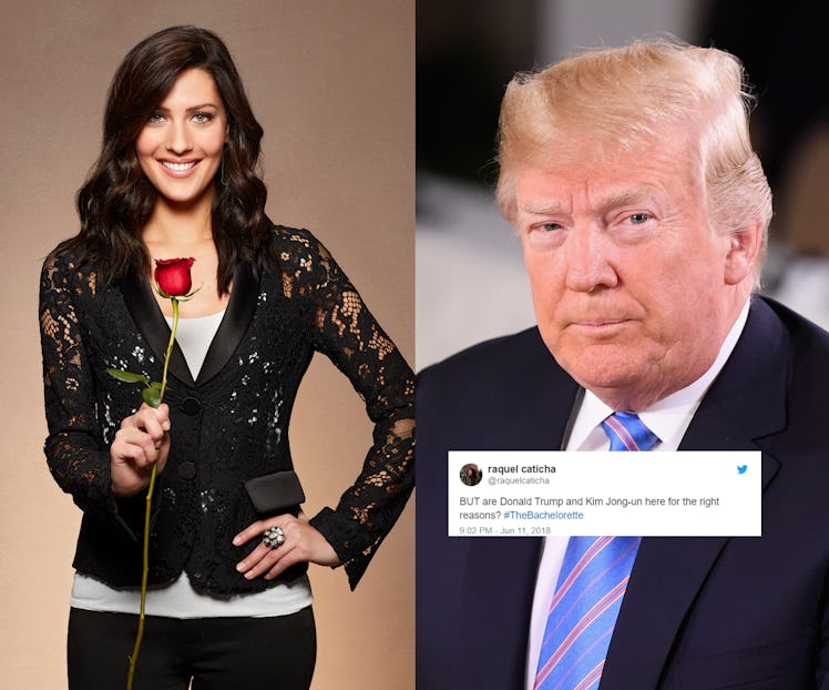 It was just a typical Monday night dedicated to The Bachelorette. We were refilling our wine glasses and retweeting franchise alums' live reactions when, all of a sudden, reality crashed into our escapism. ABC cut to live footage of President Donald Trump meeting North Korean leader Kim Jong-Un at the Singapore summit, and these Bachelorette vs. Trump tweets actually made the interruption worth it.