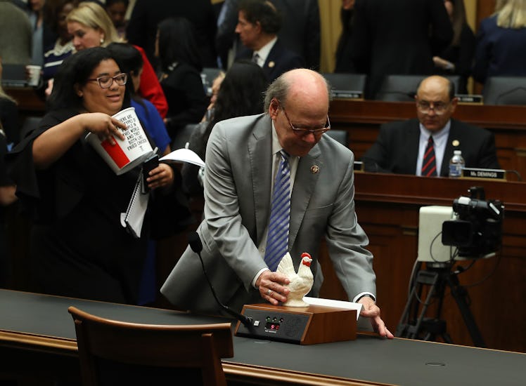 While the representatives were gathered in the House, Cohen sat in his seat eating chicken. When he was finished, he then placed the ceramic chicken where Barr was supposed to be sitting, according to USA Today. Following the hearing, Cohen told reporters (while holding the ceramic chicken) that "Chicken Barr should have shown up today and answered questions," according to CNN. Elite Daily reached out to the office of the attorney general for comment on Cohen's remarks, but did not immediately hear back.