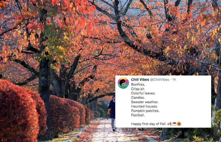 It's time to trade in your summer hats for thick scarves because it's officially fall. Sept. 23, marks the first day of fall, and fans of the cozy season are taking it to social media to celebrate the beginning of fall. With plenty of orange leaves, oversized sweaters, and bright pumpkins, checking out the themed photos on social media are the quickest way to ring in the season. These first day of fall 2019 tweets will get you in the mood for afternoons filled with pumpkin spice lattes and evenings by the crackling fireplace.