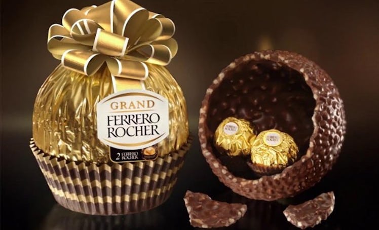 Before I get into detail, let me ask you this: What's better than one Ferrero Rocher? That's right: two Ferrero Rochers. That's why I'm so hyped about one of the company's latest Valentine's Day offerings, officially called the Grand Ferrero Rocher. Before you assume that it's simply an oversized Ferrero Rocher, think again. Believe it or not, the "Grand" version of the chocolate includes much more than what meets the eye. For instance, according to its Amazon product page, there is a hollow hazelnut and milk chocolate globe inside the candy's golden packaging.