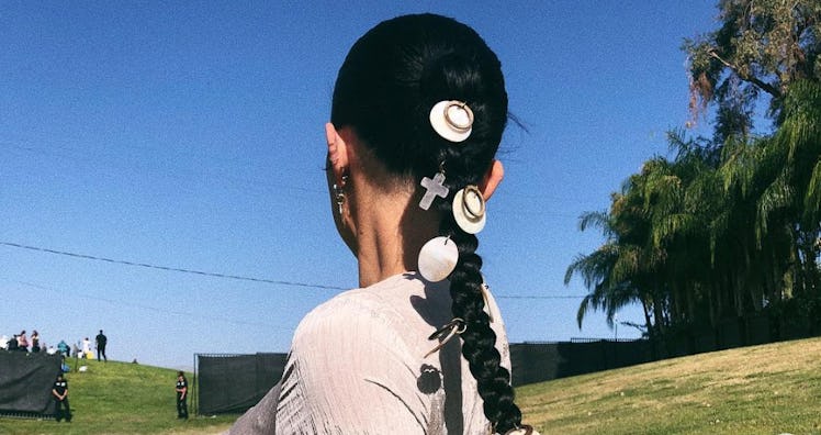 If you saw the beyond gorgeous hairstyle that Kylie Jenner sported during the second weekend of Coachella, then chances are you've been tempted to buy a collection of hair charms for braids to add to your beauty closet. The look— which centered on a long, slicked-back plait — was threaded with seashells and crosses, giving it a super ethereal effect. Seeing as Jenner rocked the style at Kanye West's Sunday Service Coachella performance, which appropriately took place on Easter Sunday, the trinkets were extremely apropos. It's only a matter of time before this look catches on with the masses and becomes the new hairstyle du jour, so go ahead and rock it while it's fresh.
