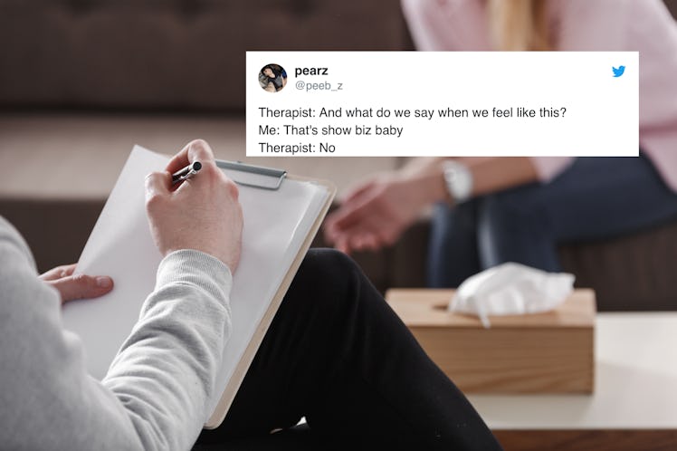A recent meme format has popped up on Twitter that's all about people — ironically — disappointing their therapists. The first quote in the format will be from the supposed therapist, who says something like, "and what do we say when we feel like this?" or "and what do we say when we feel this way?" The next part of the meme is where the joke usually comes in, like in @artifexartem's tweet where the therapist asks, "Now, what do we say during times like this?" and the client responds, "It really do be like that sometimes." The last part of the tweet is usually the therapist saying "no" to whatever slightly ridiculous thing the client just said. I'm going to go out on a limb and say these are probably not real conversations with therapists — but if they are, at least everyone's having fun in their sessions?