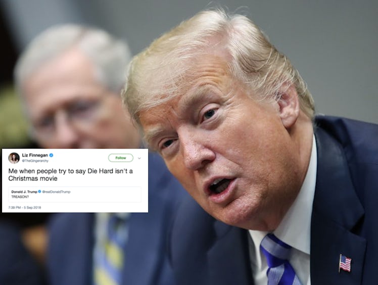 I'd imagine that your facial expression right now is, well... one of extreme confusion. Maybe one eyebrow is in the air, or you're squinting at the screen. Don't fret, because you're not alone. At first, it seemed like nobody really knew how to respond to this all-caps, one-word tweet from the President. It might be a response to the NYT article, but nonetheless, it seemed really out of the blue. For a refresher, treason is defined as the betrayal of one's country or an attempt to overthrow the government, and it is punishable by "life in prison or even execution," per The Washington Post.