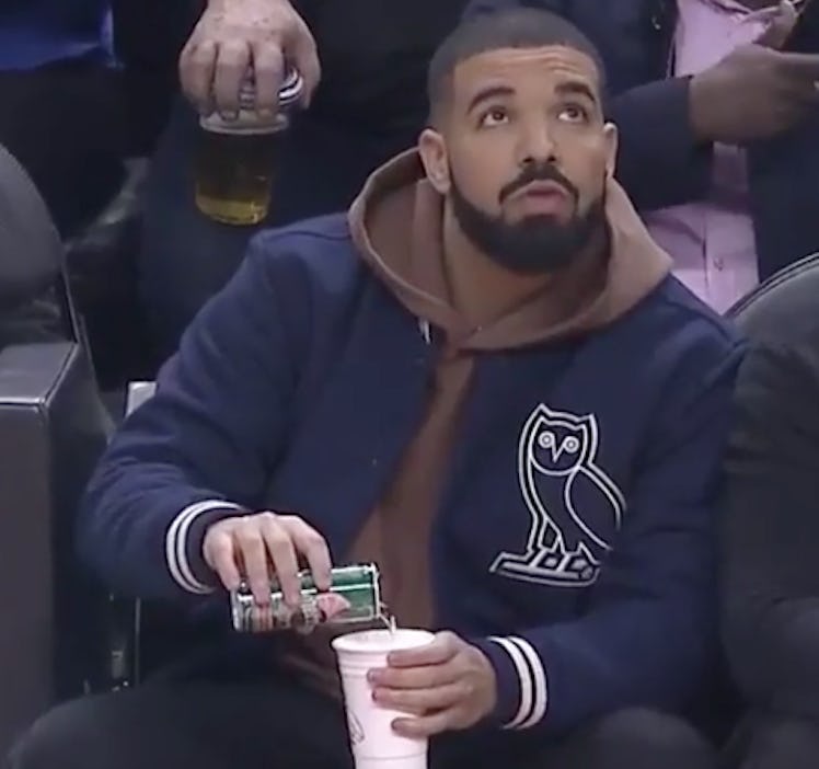 If you're a Drake fan, then you know that the Toronto native is a fan of his hometown basketball team. Recently, the singer made his way to a Toronto Raptors game and found himself on the jumbotron. You'll be glad to know that the camera caught him mid-pour while making a courtside beverage, and now you have these memes about Drake pouring a drink at the Raptors game to provide a good chuckle.