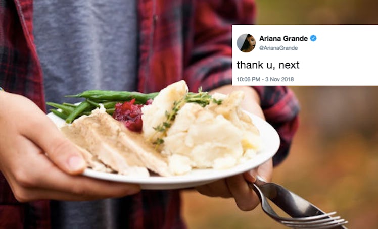 First, let's do a recap. As you know, 2018 has been a year full of viral memes that'll either make you scratch your head or laugh hysterically. There were the "Is this a pigeon?" memes, the Yodeling Walmart Kid memes, and so many more. Thankfully, the internet worked together to create a bevy of Thanksgiving memes that prove how excited everyone is for Turkey Day. Some of them incorporate pop culture references (hello, "thank u, next"), while others use screenshots of classic TV shows that they can relate to throughout Turkey Day. Regardless, they're all hysterical and will definitely help you show your followers how much you truly love a good plate of mashed potatoes.