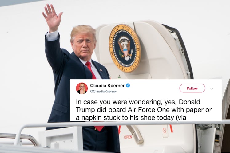 On Thursday, Oct. 4, President Trump had a little extra baggage on his person while he was boarding Air Force One, per BuzzFeed. The President had what looks like a piece of paper or a napkin (possibly toilet paper?) stuck to the bottom of his left shoe. Elite Daily reached out to the White House for comment but did not hear back at the time of publication.