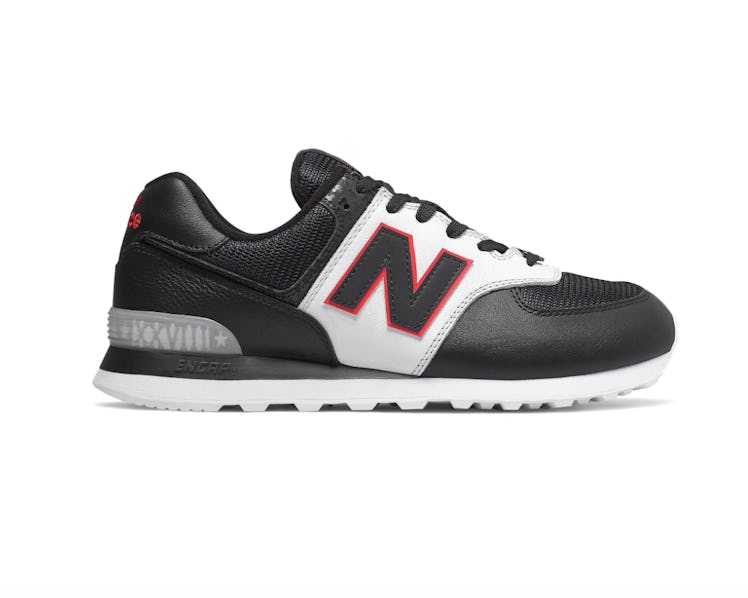Next up is the 574 Sneaker ($90, shopdisney.com)—if you're looking for something less sporty and more streetwear-inspired, this style is for you. It's also crafted from a mixture of leather and mesh but the combination manifests in a very different structure. A white saddle cuts across the shoe and is emblazoned with a black, red-rimmed N on the outside and inside. "MCMXXVIII'' appears on the heel stabilizer as an ode to the year 1928, when Mickey debuted, and Mickey's white glove also appears as a lace lock on this style.
