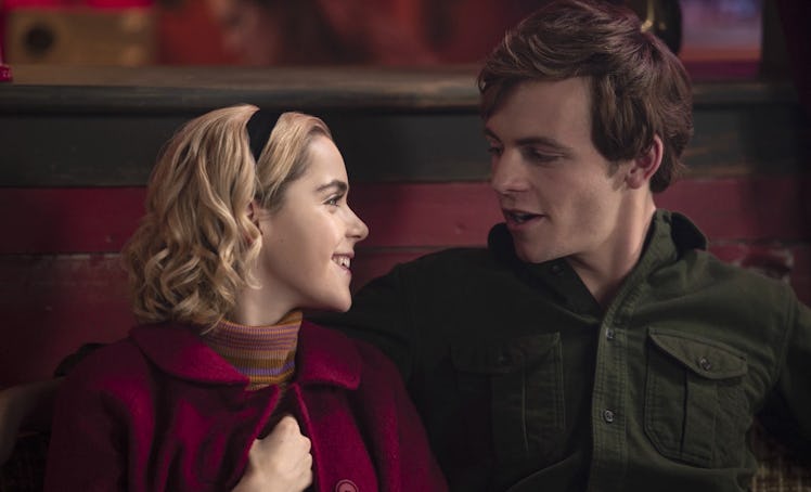 When we last saw Sabrina Spellman, she was really not in the best place romantically. In the Chilling Adventures of Sabrina Season 1 finale, Sabrina signed her name to the Book of the Beast, an act requiring her to fully embrace her witch side, and said goodbye to her mortal boyfriend Harvey Kinkle because of it. In the show's holiday special A Midwinter's Tale, Harvey made it clear that he wants nothing to do with Sabrina's magical powers, basically saying that the two will no longer be speaking to one another going forward.