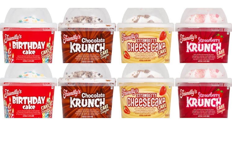 Grab your spoons, because Friendly's just launched four new Cake Singles flavors, according to a Feb. 28 press release. TBH, it's hard for me to choose just one because they all sound so delicious. I'll let you decide which one to eat. The individual servings of ice cream cakes are sold in the following four flavors: Birthday Cake, Chocolate Krunch Cake, Strawberry Cheesecake, and Strawberry Cheesecake. See what I mean? So hard to choose. Thankfully, Friendly's is making the choice a little easier on us since these are sold as one-person servings.