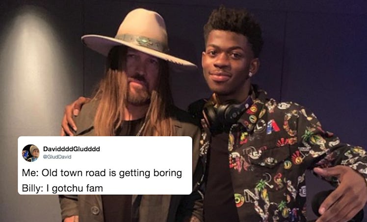 I'm embarrassed to say I was late to the "Old Town Road" movement, but I'm damn happy to be here now. Rapper and musician Lil Nas X is at the forefront of music industry headlines right now thanks to his unusual hit, and now Billy Ray Cyrus has gotten involved. After Lil Nas X's hit single got unceremoniously removed from the Billboard country charts for not being country enough, the young hip-hop artist teamed up with the country vet (and Miley Cyrus' dad) to propel the track to brand new cross-genre heights. And they're bringing a slew of hilarious memes with them. These "Old Town Road" memes are a delicious bite of what can happen when two beloved musical genres collide and the internet is here for it.