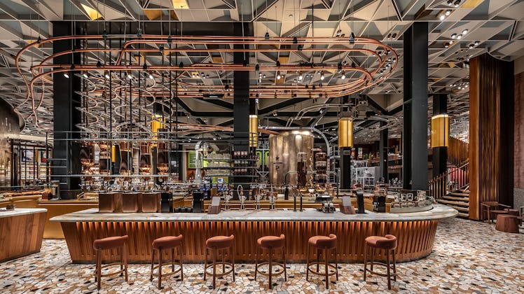 Speaking of bars, Milan's Starbucks Reserve Roastery even features a Arriviamo Bar that sells cocktails, special coffee orders, and "small delicacies," per Starbucks. So, once you're done sipping on your coffee at the marble countertop, head to the mezzanine for a specialty cocktail.