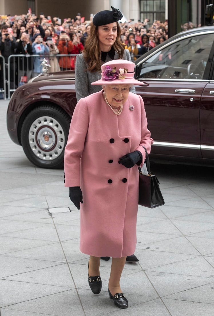 Kate wore a gray Catherine Walker coat dress, a black Sylvia Fletcher fascinator, and dark Gianvito Rossi heels. The queen was dressed in her signature bright colors, donning a perfectly pink coat and hat. In the video of their arrival, which was tweeted out by The Royal Family's Twitter account, fans can see that Kate waited for the queen to exit the car before stepping out.