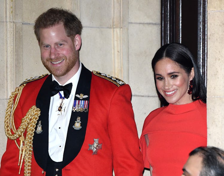 On Saturday, March 7, it's safe to say that the Duke and Duchess of Sussex wowed everyone with their second public appearance since announcing that they were planning to step back as senior members of the royal family. Prince Harry, who donned his official uniform for Captain General of the Royal Marines likely for the last time, went for a red dress code along with his wife. The former Suits star kept with the trend of eye-popping hues she's worn lately and stunned in a red cape dress by Safiyaa. She accessorized the crimson look with statement ruby earrings, a red satin clutch by Manolo Blahnik, and red suede Aquazzura pumps. The pair were greeted by a round of applause as they entered Royal Albert Hall and went to sit in the royal box.
