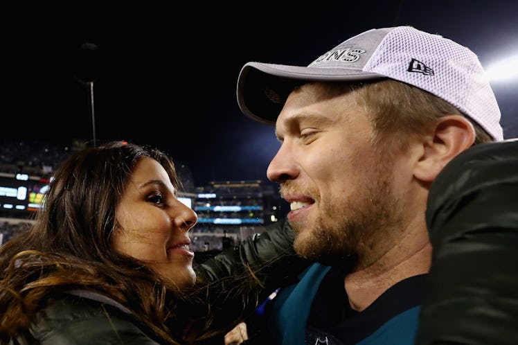 While the New England Patriots’ Tom Brady and his wife Gisele Bündchen may be the most famous couple heading to Minneapolis this weekend for Super Bowl LII, there may actually be an even more incredible love story on the opposite side of the field. I’m talking about Philadelphia Eagles quarterback Nick Foles and his wife Tori Moore. If you aren't familiar with them, well, that is by design. Photos of Nick Foles and his wife can be awfully hard to come by. The two are pretty private, and their social media presence is practically nonexistent, but we got a sneak peek at their partnership when the two celebrated with an amazing kiss on the field after Foles lead his team to victory over the Vikings and into this year's Super Bowl. And now, I am totally obsessed.