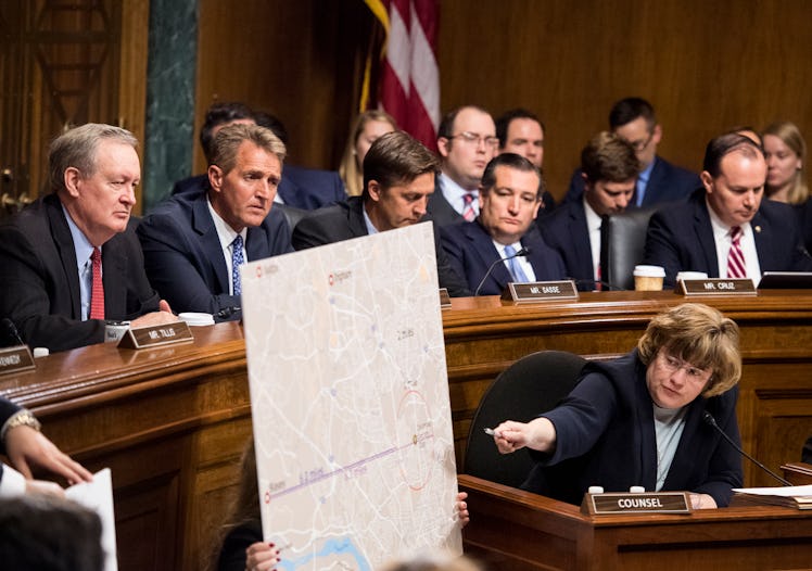 The world is watching as Dr. Christine Blasey Ford testifies before the Senate Judiciary Committee on Thursday, Sept. 27. By the afternoon, Ford had already endured hours of questioning regarding her allegations that she was sexually assaulted by Supreme Court nominee Brett Kavanaugh while the two were in high school, which Kavanaugh has denied. Elite Daily repeatedly reached out to the White House for comment on the allegations but did not hear back. But for all the drama, these photos of senators at the Kavanaugh-Ford hearing are drawing criticism over the makeup of the panel of senators hearing her testimony.