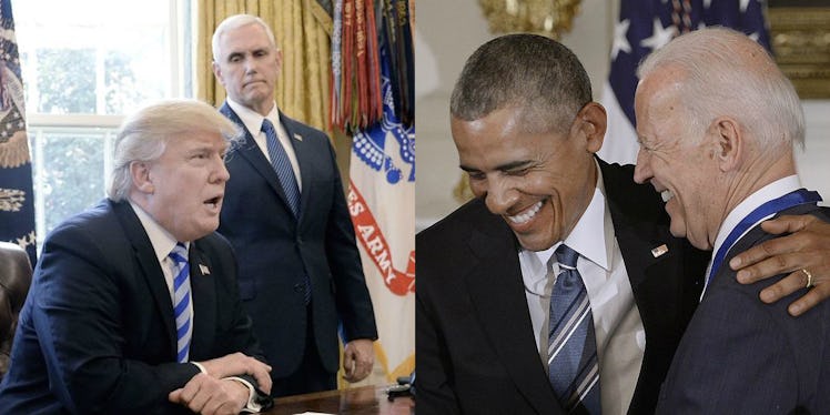 At Rev. Billy Graham's funeral in March, President Donald Trump massaged Vice President Mike Pence's thigh — reaching around first lady Melania — in an apparent effort at consolation. It was that classic display of male camaraderie — good ol' platonic leg-touching — that conveyed so much about their relationship. There's no contrast more stark than that of Trump-Pence and President Barack Obama and Vice President Joe Biden. A picture is worth a thousand words, and these photos of Trump and Pence vs. Obama and Biden reveal the depth of their differences — and will give you a much-needed laugh break.
