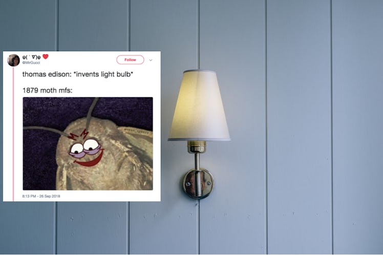 Ah, the vast (and highly unpredictable) world of memes. Sometimes, memes bring pure joy, and other times, they lead to an unwavering sense of sadness (in the event that they're relating to the POTUS, for example). Anyway, after taking a look at the internet's latest meme, I'm mostly filled with fear, horror, and unshakeable anxiety. So, if you haven't already seen these popular memes about moths and lamps, they might seriously haunt your dreams forever, until the end of time. I don't know about you, but there's absolutely no way I'm sleeping a wink tonight.