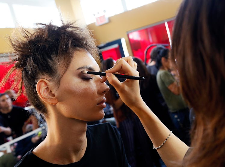 While the clothes said more Old Town Road, the makeup looks said Euphoria. Celebrity makeup artist Sir John created this monochrome look using UOMA Beauty products. “The eyes are definitely a focus of the beauty look”, said Sir John in a press release sent to Elite Daily. “There is a feline silhouette that runs parallel with all the models. It’s not just about a smoky eye or a feline flick, but there’s a fiery lift and an artisanal whimsical effect to the ends of the line that gives the eyes flight."