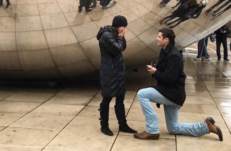 I got engaged the day before Thanksgiving … We were outside of Chicago visiting my family, and my (now) husband had never visited the actual city. We took the train into town and had all sorts of plans to see the city, but it was a rainy/cloudy day. I figured, at least let’s go to the Bean and then somewhere indoors. We took a few selfies and then decided to get one more photo which turned into his proposal! After a glass of champagne, we took the train back to my grandparents’ house where we shared the exciting news with family. Dinner that night was deep dish pizza and champagne in celebration.