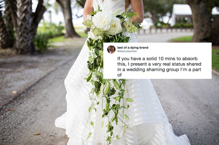 I've never been engaged but, from what I've been told, planning a wedding can bring out some intense antics. That seems to be the case for one woman who not-so-simply "wanted to be a Kardashian for a day" when she tied the knot with her high school sweetheart. Unfortunately, tying the knot like a Kardashian involved a $60,000 wedding that the couple simply couldn't afford. So, they asked her guests to pay for it. And these tweets about a bride demanding money from guests just go to show the whole thing panned out exactly as you might expect. (Elite Daily has reached out to the person who tweeted the bride's story (Twitter user @0lspicykeychain), which came from a wedding-themed Facebook group, for comment.)