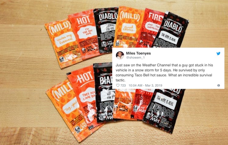 Do you ever wonder what you would do for survival if you were trapped in a car? On Friday, March 1, an Oregon man was apparently found in his car after being stranded for five days, per The Oregonian, and he claimed he survived by eating, wait for it... Taco Bell sauce packets. Impressed? Twitter seemed to be, too. Take a look at these tweets about a stranded man eating Taco Bell sauce packets to get a feel for why Twitter was so here for this fast food hero.