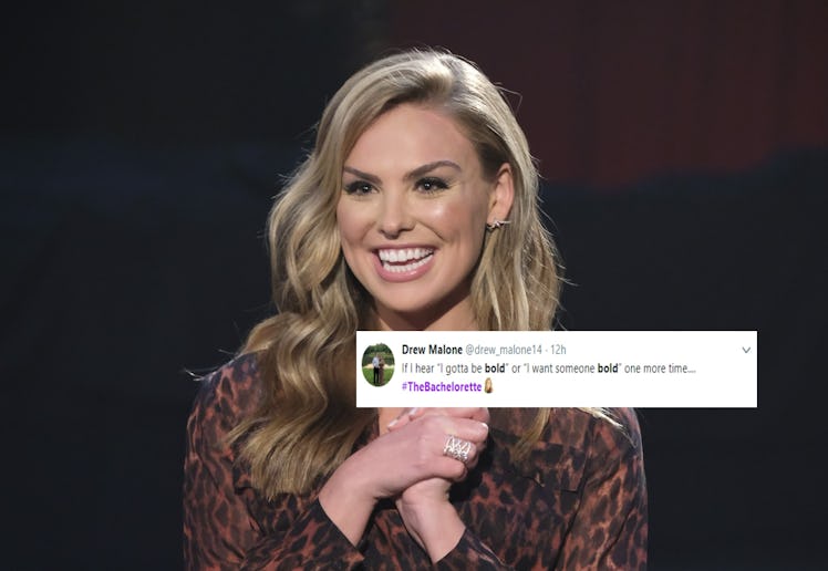 Every lead in the Bachelor franchise has a quirk or catchphrase that inevitably pops out over the course of a season. Bachelorette Becca Kufrin loved telling everyone to do the damn thing, while Bachelor Arie Luyendyk Jr. frequently said, "I love that." Only two episodes of Hannah Brown's Bachelorette season have aired, but Bachelor Nation has already caught on to her go-to phrase. Tweets about being "bold" on The Bachelorette have taken over, so buckle in for plenty of reminders that Hannah wants to embrace her bold side this year.