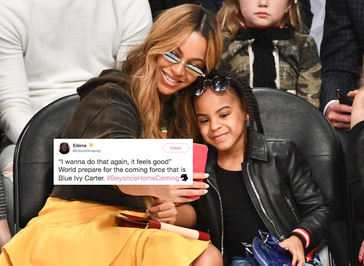 Queen Bey's Homecoming documentary finally dropped on Netflix on April 17, and not even a full day following its release, fans have already decided that the second coming of Beyoncé is here... and her name is Blue Ivy Carter. The tweets about Blue Ivy in Homecoming fawn over Blue Ivy's singing and dancing in the doc. And the best part about it? Blue's singing clip is also on the Homecoming album.