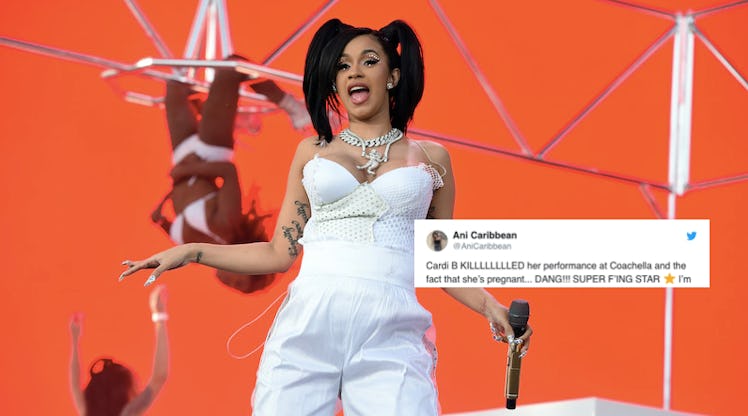 How do I love Cardi B? Let me count the ways. But it's not just me, because the entire world sees just how talented and hilarious the rapper is. And, since revealing her pregnancy, many people didn't know how she'd perform at her Coachella set on Saturday, April 14. But guess what? In true Cardi B style, she absolutely crushed it, proving that you can be pregnant and still kick *ss on stage. And don't think that she simply stood up in front of the hundreds of thousands of people and sang — no, no, no. Our girl got down, and it was an actual dream to witness. If you don't believe me, then maybe these tweets about Cardi B's Coachella performance will show you how the mama-to-be rocked the damn stage off.