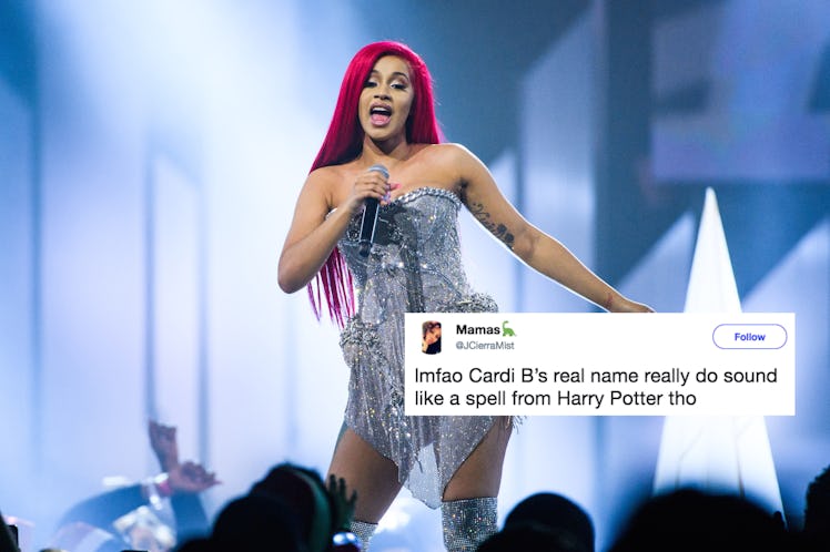 Cardi B's name is pretty unique. We already knew she got the nickname "Cardi B" because it was a childhood nickname. The rapper said during an interview with Jimmy Fallon that growing up, people started calling her Bacardi because her sister's name is Hennessy. Eventually, she shortened that nickname to Cardi B, and the rest is history. But people are just now learning what Cardi B's real name is and the responses are hilarious. Tweets about Cardi B's real name are some of the funniest things on the internet right now, and you'll be glad you read them. Before we can dive into the tweets about Cardi B's name, though, we have to talk about her actual name. Are you ready for this?