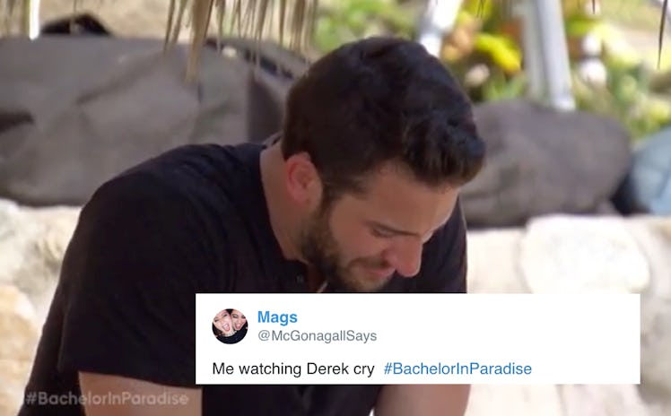It'd be naive to think any couple on Bachelor in Paradise is ever totally safe from rocky waters, since there are always other options out there. That’s been the case for Demi and Derek, since Demi’s been juggling feelings for him and another person. Demi was open and honest about how conflicted she felt, but that didn't make the situation any easier for Derek. In fact, her multiple talks with him during Week 3 Part 2 came with a whole lot of tears. These tweets about Derek crying on Bachelor in Paradise show just how much love Bachelor Nation has for him.
