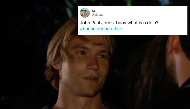 It was the fight heard 'round the world when John Paul Jones interrupted Chris Randone and Krystal Nielson's wedding festivities to give Derek Peth a piece of his mind. Both men had been pursing Tayshia Adams during Season 6 of Bachelor in Paradise, and JPJ got super competitive with Derek. In fact, he got so angry with him that their fight carried over from the wedding all the way into the following days at the resort. Their fight in the Sept. 2 episode got even more explosive, and these tweets about Derek and John Paul Jones' fight show just how wild it was to watch.