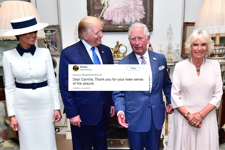 President Donald Trump kicked off his visit to the United Kingdom on June 3 by visiting the royal family at Buckingham Palace. A few notable royals were in attendance, and these tweets about Duchess Camilla winking during Trump's visit to the UK prove it was one of the most iconic moments of the trip. It looks like even royals can throw shade.