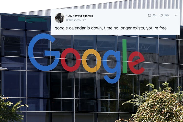 But my personal favorite tweets in the wake of Google Calendar's outage were about the dissolution of time itself — because if Google Calendar doesn't exist, neither does time. Sorry, I don't make the rules! Twitter user @thmsbrns, for example, tweeted, "google calendar is down, time no longer exists, you're free." Another Twitter user, @hels, wrote, "Google calendar is down so legally time doesn't exist anymore."