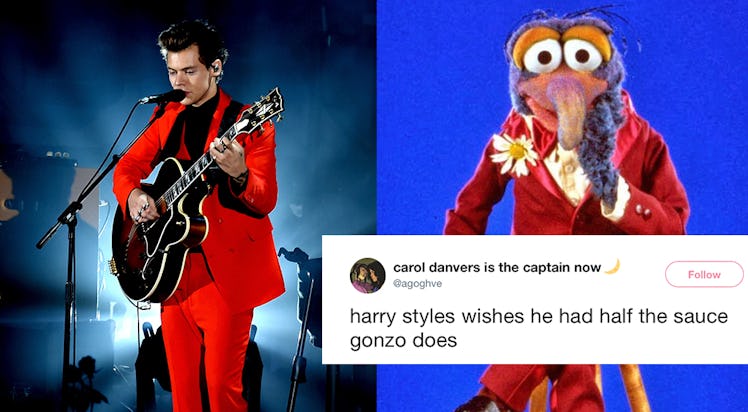 Of all the strange and unexpected Twitter moments I've seen in my hours spent scrolling, the one to catch my eye this morning was a comparison I certainly didn't see coming. Nevertheless, I'm glad we live in a world where people are tweeting about Harry Styles dressing like Gonzo from 'The Muppets,' because it really is an important topic we need to discuss. There is photographic evidence that heavily suggests Styles and the Muppet in question share the same closet, or, at the very least, work with the same stylist.