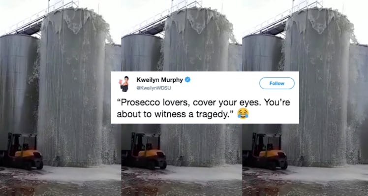I have been known to spill a glass or two of wine in my life (it happens), but that's nothing compared to what happened recently at a wine distillery in Italy. According to video captured by the L'enoteca Zanardo Giussano, a massive tank of Prosecco somehow exploded, leaving thousands of gallons of the Italian white wine overflowing from the container. It is a near tragedy for Prosecco lovers like me, but I'm finding some comfort in messages from Twitter users about the whole ordeal. These tweets about an Italian winery spilling 8,000 gallons of Prosecco are so relatable.
