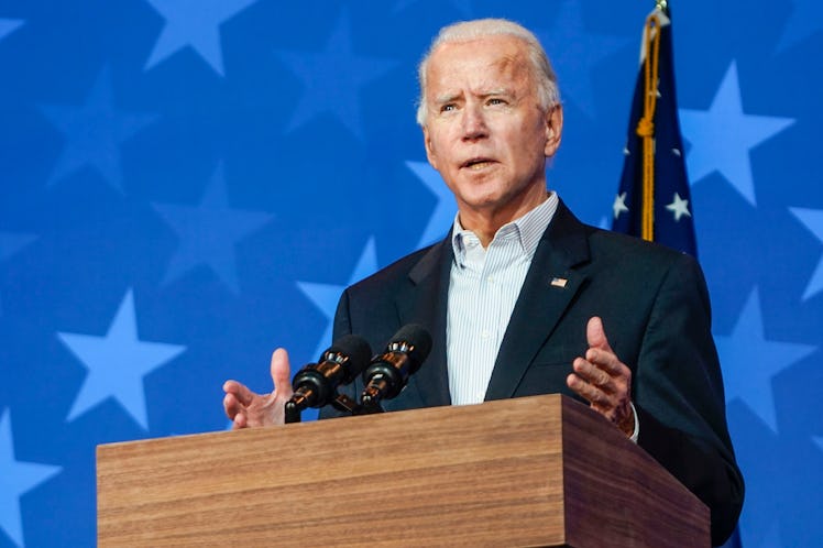 The new president-elect appeared to make reference to Trump's infamous campaign slogan during a victory speech in Wilmington, Delaware, on Saturday, Nov. 7. Rather than saying he would make the country great again, Biden addressed the crowd with more specifics, saying, "I sought this office to restore the soul of America. To rebuild the backbone of the nation — the middle class. To make America respected around the world again and to unite us here at home."