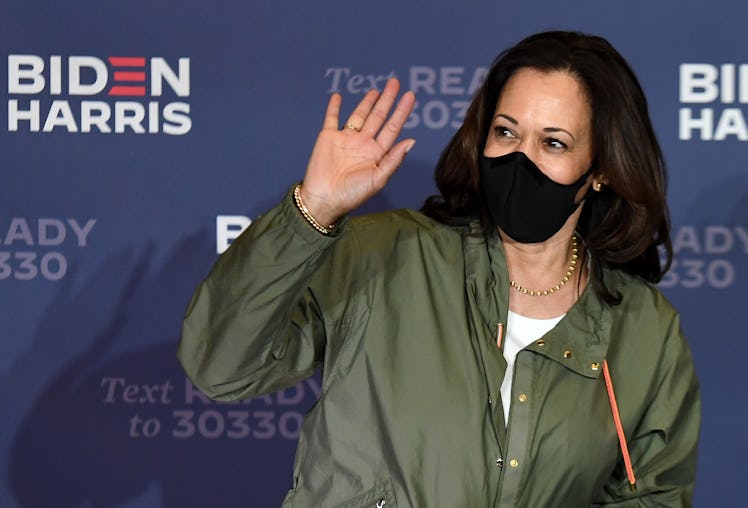 After sparking an outpouring of love and "wow, me" statements on social media for her continued decision to wear Converse Chuck Taylor sneakers on the campaign trail (and long before that as well), Kamala Harris' most recent fashion choice sparked another wave of commentary on social media — and perhaps a bit of deja vu for some. Several people recently tweeted about Harris' green jacket, particularly about how the jacket reminded them of Melania Trump's controversial "I Really Don't Care Do U?" jacket she wore in 2018. (Of course, Harris' did not have the same white text scrawled across the back.) More so, because the jacket is similar in style to Trump's, several users think Harris could have made an even bigger statement with hers.