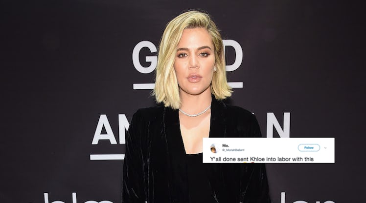 And so the plot thickens with Khloé Kardashian and Tristan Thompson. By now, you may know that there's a report that claims Thompson cheated on a very pregnant Khloé Kardashian. But now, things are getting even crazier, because it seems that Kardashian might be going into labor, according to TMZ. According to sources, she is having early contractions (her due date is reportedly at the end of April), so many of her family members are hopping on a plane, flying to Cleveland to be by Kardashian's side. Going into labor early is no joke, and these tweets about Khloé Kardashian going into labor all have one conclusion: fans think that the stress of the recent cheating news has caused Kardashian to start having early contractions.