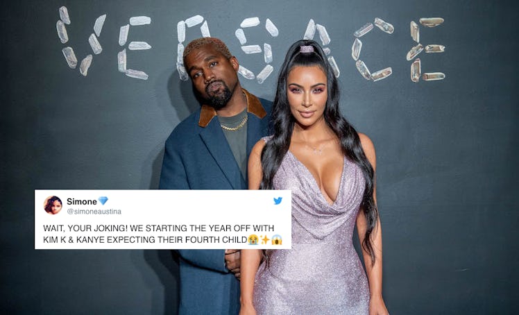 In case you were too busy popping bottles of champagne while ringing in the new year, Kim Kardashian and Kanye West are reportedly expecting their fourth child via surrogate. Yes, fam, another Kardashian baby is seemingly on the way! It's not known whether or not the reported surrogate will be the same woman who Kim and Kanye chose to carry and give birth to Chicago West back in January 2018. Elite Daily reached out to the couple's teams for confirmation on the pregnancy reports but did not hear back by the time of publication. If the reports are true, then I, for one, am beyond excited, and these tweets about Kim Kardashian and Kanye West's reported fourth baby prove that the world is equally pumped.