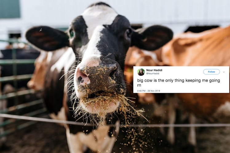 OK, OK, I guess I feel a little bad about Pearson's late night phone and his farm's sudden fame. But TBH, the world can't help but adore this gigantic cow. Amidst a helluva lot of worldwide drama, Knickers is the hero that everybody needs right about now. He's quite large, apparently he's in charge, and he's basically taking over my entire Twitter feed. And I don't know about you, but I, personally, am not mad about it.