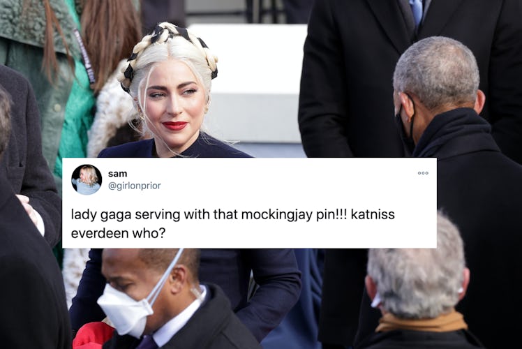 Of course, it's important to note that Gaga was not, in fact, wearing a mockingjay. Rather, the pin features a flying dove holding an olive branch, a popular symbol of unity and peace, which aligns with Biden's near-constant message of bringing unity back to the United States. Still, Twitter lives for a pop-culture moment, and Lady Gaga Hunger Games tweets abound.