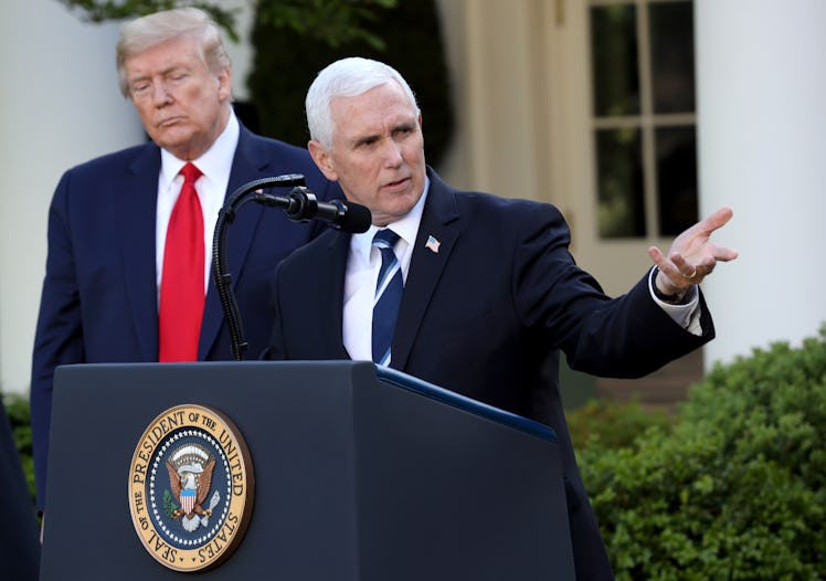 Pence isn't the only member of the Trump administration who has gotten attention for not wearing a mask, however. President Donald Trump has also declined to wear any type of face mask or covering during public appearances, noting that it wasn't technically mandatory for Americans to do so, despite health authorities' recommendations. He added that he couldn't envision himself wearing a mask while carrying out his presidential duties. "I don't think I'm going to be doing it," he said earlier this month, per CNN. "Wearing a face mask as I greet presidents, prime ministers, dictators, kings, queens — I just don't see it." Elite Daily has reached out to the White House for comment on why Trump has declined to wear a mask.