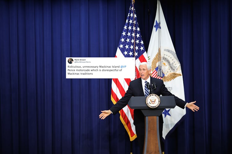 Pence's visit marks the first motorcade Mackinac Island has ever seen, and clearly it isn't sitting well with many people on Twitter. According to The Detroit Free Press, most Mackinac Island visitors travel around the area either on foot or by bike. The island itself is less than four square miles and only 500 people live there year-round, according to the island's website.
