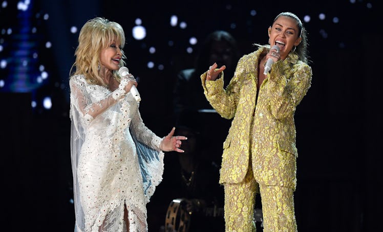 One of the biggest moments at the 2019 Grammy Awards this Sunday night was a sprawling tribute to country music pioneer Dolly Parton. The performance kicked off with Kacey Musgraves and Katy Perry, before Parton herself stepped onto the stage decked out in all white. The performer that everyone was waiting for then joined Parton on stage: the country icon's goddaughter Miley Cyrus. The two performed "Jolene" together, and then welcomed Maren Morris to the stage to perform "After the Goldrush" with them. Cyrus came back out at the very end of the tribute to join all of the singers in singing "9 to 5" as a group.
