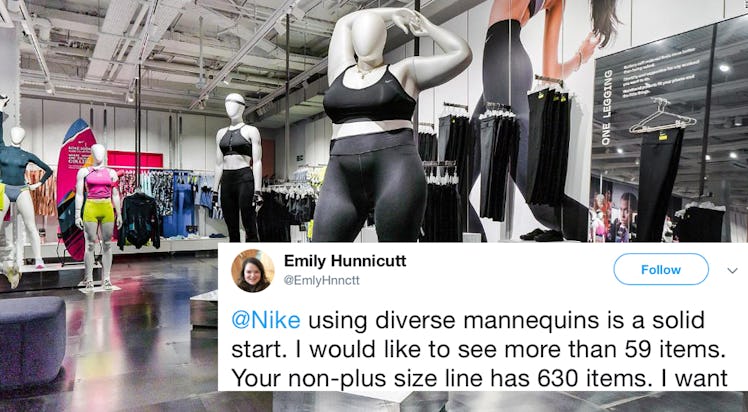If you're someone who falls outside of the range of standard clothing sizing, it's pretty unlikely that you've strolled into a store at your local mall and found yourself twinning shape-wise with a mannequin. However, as brands recognize the beauty and validity of bodies of all shapes and sizes, this standard is starting to change, and brands like Nike and American Eagle are beginning to feature mid-size and plus size mannequins at their retail locations. If you haven't seen, the tweets about Nike's new plus size mannequins are pretty much overtaking the platform — there's some negativity, of course, but most users are applauding the brand for creating a more inclusive shopping experience. Leggings and sports bras for all, y'all!