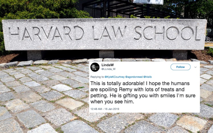 Getting into Harvard Law School isn't easy, but one cat is taking up residency at the historic Massachusetts college. Remy the cat may not have the required LSAT scores to be admitted to Harvard, but what he lacks in education he makes up for with his charming personality and dapper orange coat. And people are loving it. These tweets about Remy the Harvard Law School cat show just how adorable — and loved — the feline is around campus.