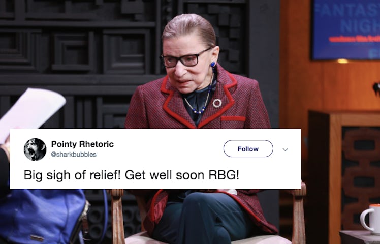 If you love U.S. Supreme Court Justice Ruth Bader Ginsburg half as much as I do, there's a likely chance you've been avidly following her recent medical procedure. The 85-year-old equality icon underwent surgery to remove cancerous nodules from her lungs on Friday, Dec. 21. In a turn of good news, it was announced on Wednesday, Dec. 26 that RBG was discharged from the hospital, and it's no surprise people are pumped. TBH, I can completely relate to these tweets about Ruth Bader Ginsburg getting home from the hospital, because they're (rightfully) so, so hyped.