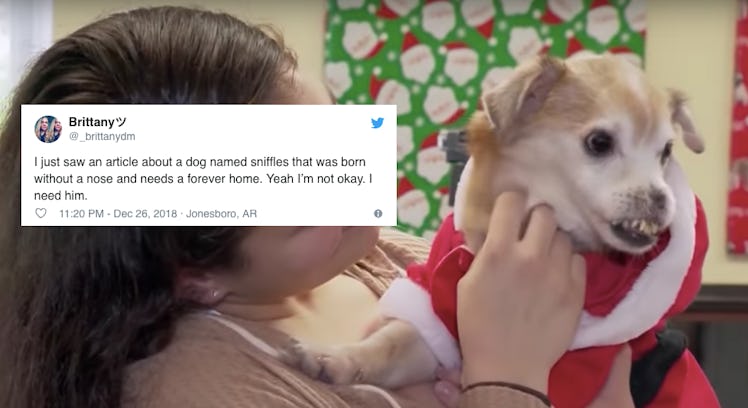 If you know me at all, you're most likely aware of the fact that I'm a sucker for anything dog-related. Puppy videos are my literal vice, and for real — those Sarah McLachlan commercials will make me cry until the end of time. And it seems as though Twitter feels exactly the same way, based on these tweets about Sniffles, a foster dog without a nose, who was saved in Orlando, Florida. The Twitterverse is coming through with so much support for the teeny pup, and I definitely feel for each and every one of their responses.